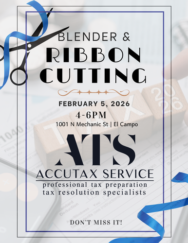 Join the El Campo Chamber of Commerce & Agriculture as we celebrate ATS AccuTax Service with a Blender & Ribbon Cutting — and yes, there will be good food and prizes!